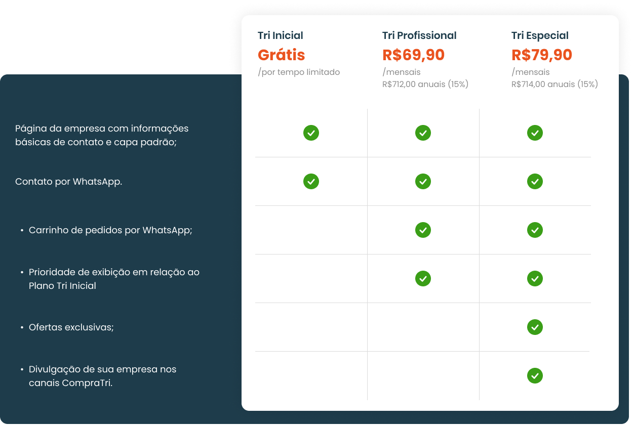 Aprovado o seu cadastro você ganha acesso a uma área onde você mesmo vai gerenciar as informações sobre a sua empresa, como redes sociais, dados de contato, links, catálogo de produtos com fotos, preços e descrição e um carrinho de compras que gera um pedido através do Whatsapp(**) da sua empresa. Além disso, gere ofertas exclusivas dentro da plataforma por períodos determinados por você e divulgue este link em outros canais de venda. As pessoas resgatam estas ofertas através do Whatsapp. O Compratri investirá na divulgação online dentro das buscas do Google e com campanhas nas redes sociais e presença nos eventos locais para atrair potenciais clientes.
